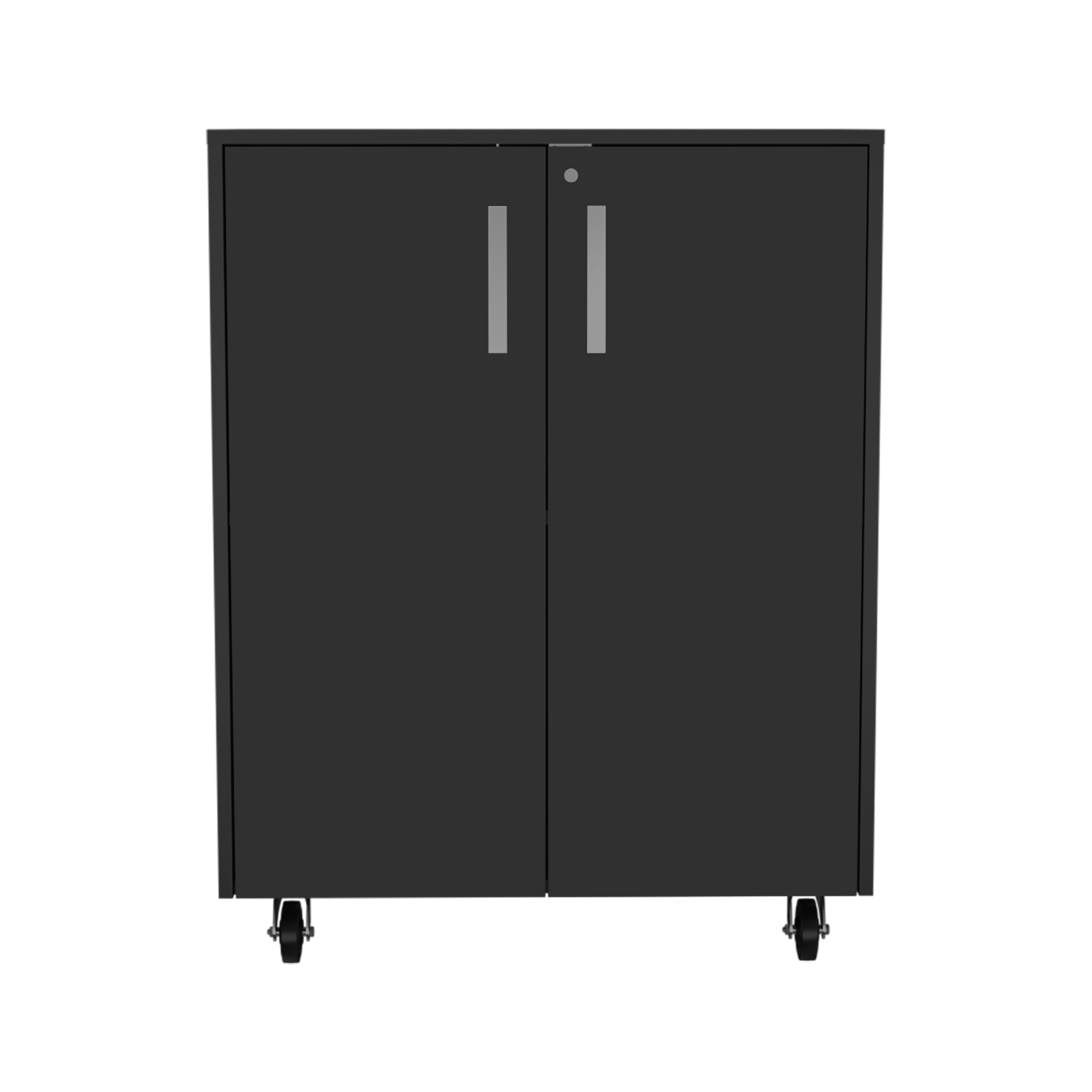 Lewis Storage Cabinet Base, Four Casters, Double Door Cabinet, Two Interior Shelves "The Lewis Storage Cabinet Base is a stylish and durable garage storage solution. Perfect for storing anything from tools to holiday decorations, this cabinet is made with durable black manufactured wood and features an easy-to-use locking mechanism, a two-door cabinet, and three internal shelves. With its unique design, the Lewis Storage Cabinet Base is sure to complement any garage décor with its superior top (27,56''W X 15,98''D)Product dimensions (27,56''W X 15,98''D X 35,43''H)"