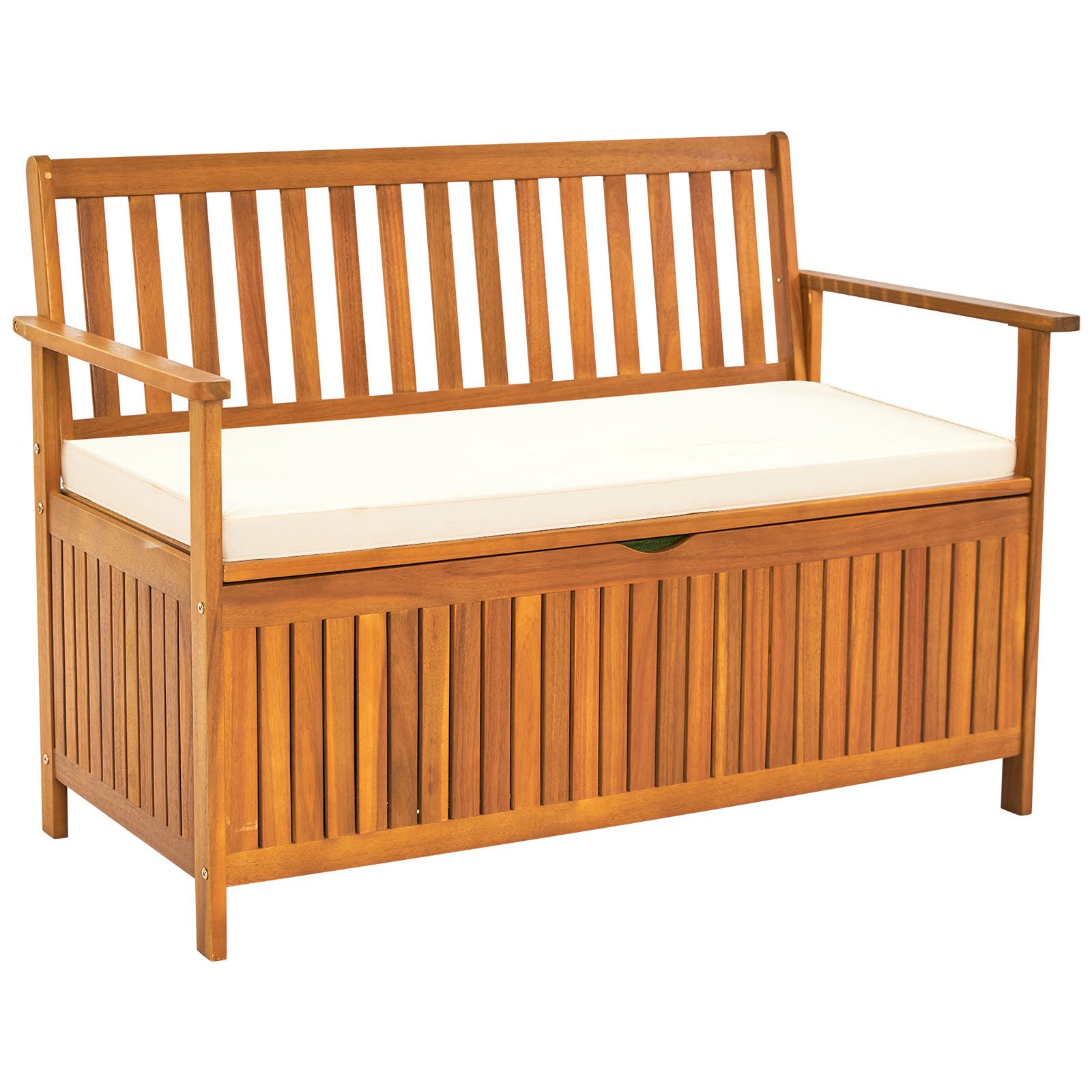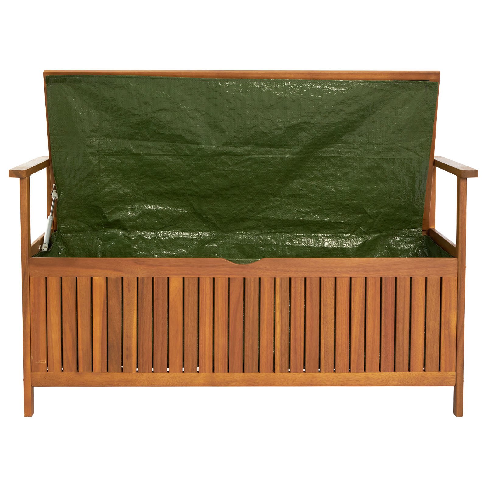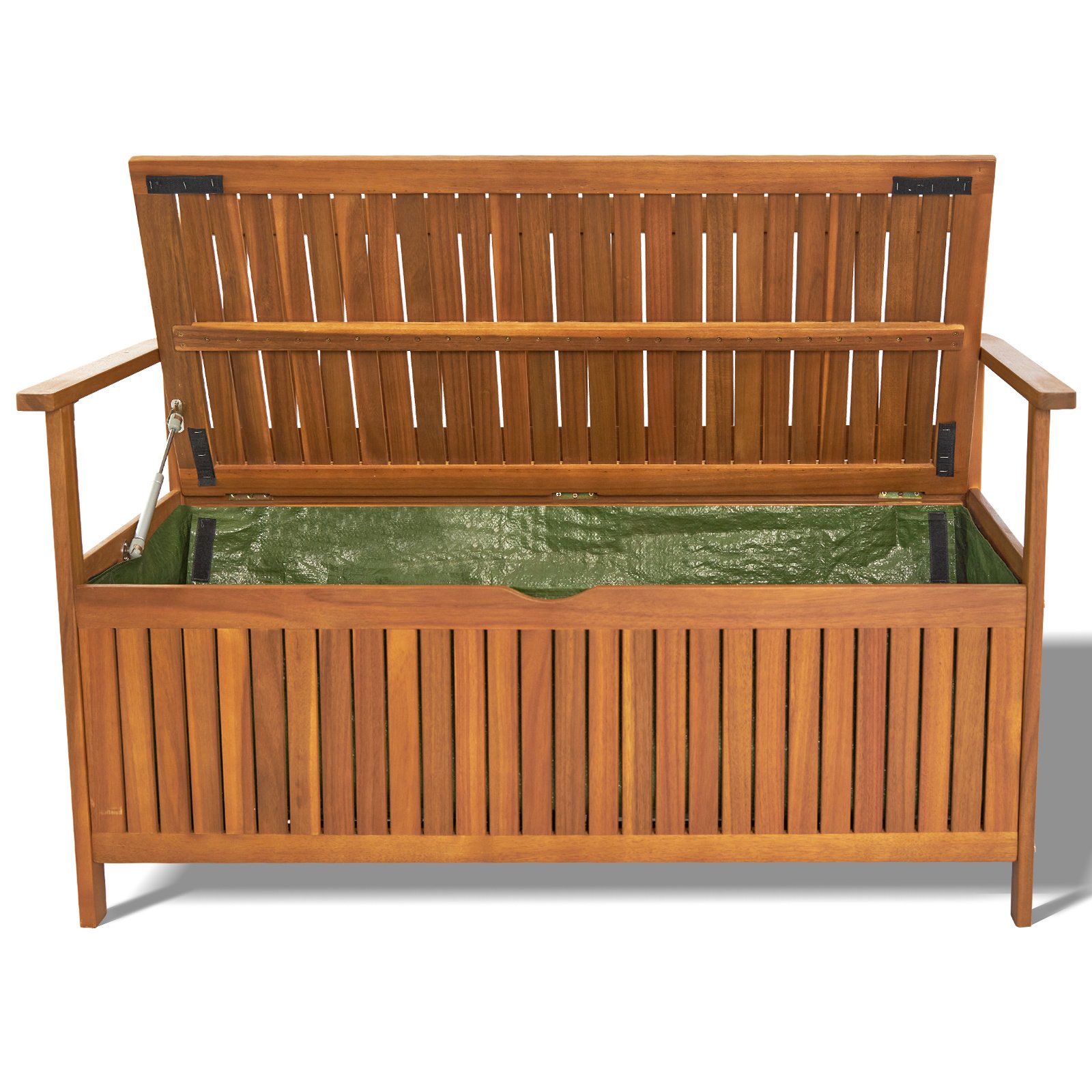 Elevate your outdoor or indoor space with our Wooden Outdoor Storage Bench, blending seamlessly with any decor while providing a practical storage solution and comfortable seating. Crafted from premium acacia wood, this bench boasts a solid structure capable of supporting up to 550 lbs. Its meticulously polished slats not only exude a classic charm but also offer waterproof qualities. Beneath the hinged lid lies a spacious 43-gallon compartment, equipped with a pneumatic rod for safe lid operation and a grooved handle for ease of access. This bench comes with a waterproof and dustproof inner lining, ensuring your stored items remain dry and clean. Whether used for seating or storage, this versatile bench is an ideal addition to any outdoor or indoor space, requiring minimal assembly and maintenance.