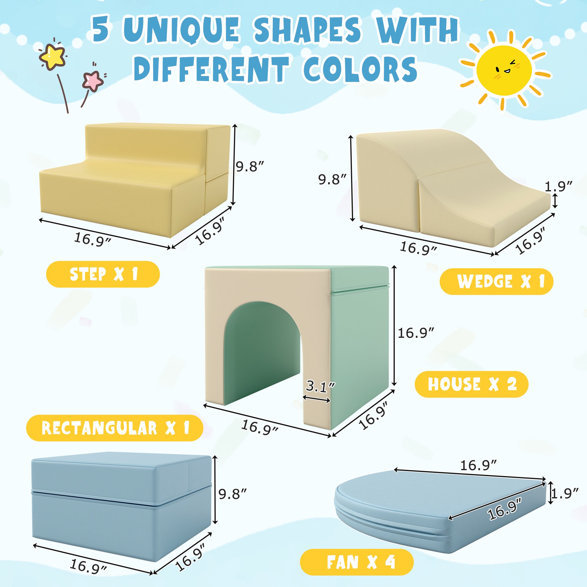 Various shapes and colors: Competed with the the traditional foam blocks, our climb and crawl foam play set has 2 house-shaped blocks, one step, one wedge and 3 fans to meet different needs of playing and placing. Not mention the different colors, makes these blocks not only versatile but also visually appealing.