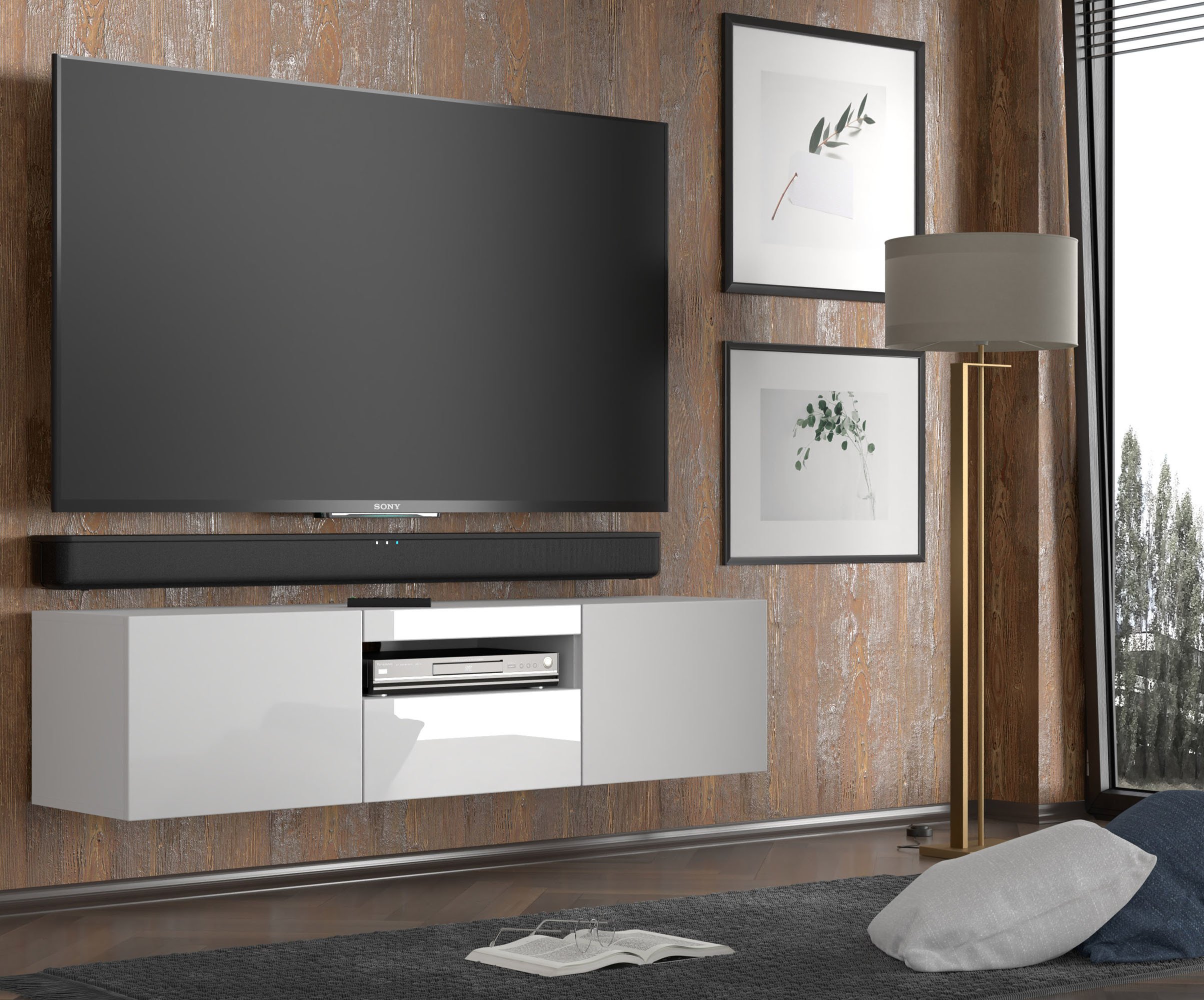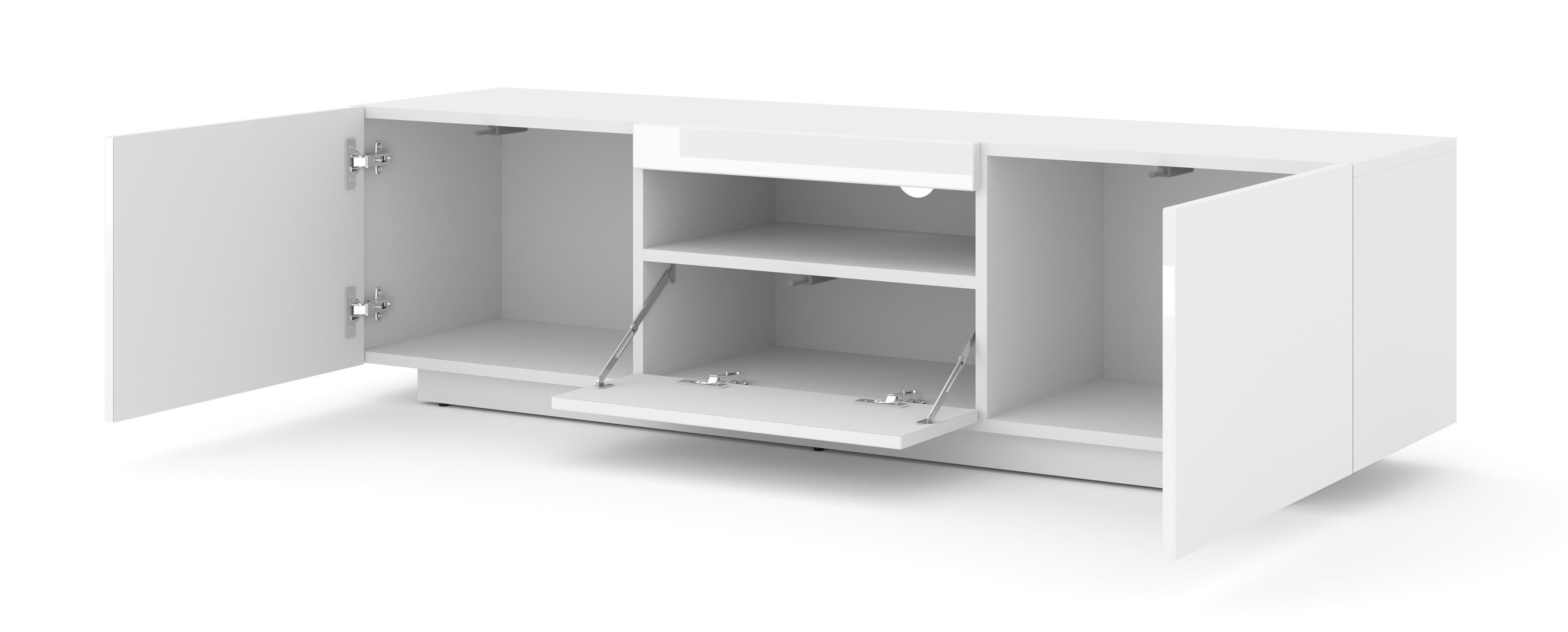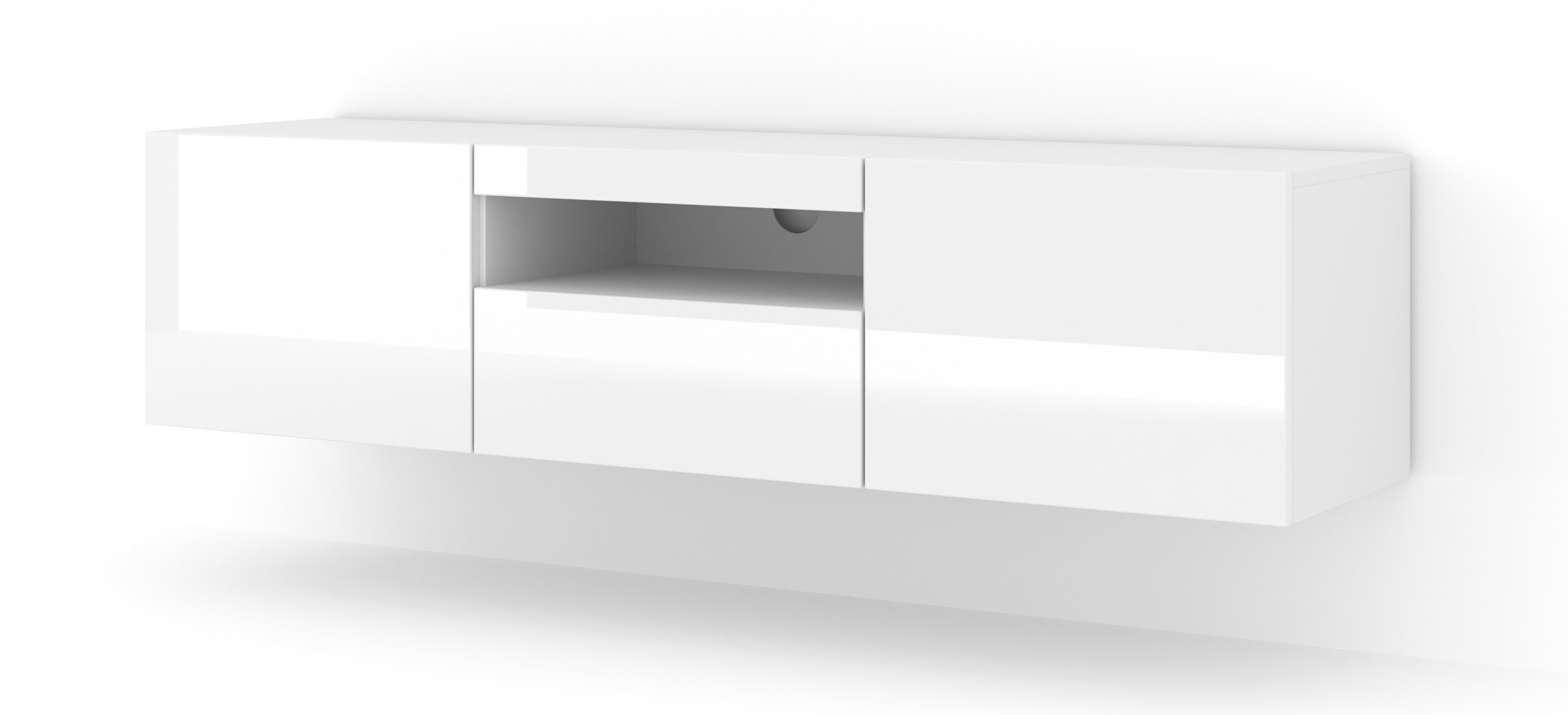 Universal cabinet, hanging or standing, to choose from during assembly. Optional basel. It has two closed shelves that open to the sides, one closed shelf that opens downwards, one open shelf (for consoles or set-top boxes). TV shelf with cable hole in the back panel.